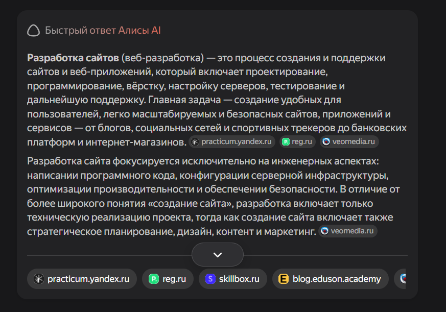 Блоки "вопрос - ответ" - один из главных форматов, который AI использует напрямую. Страница услуги с текстом "мы делаем сайты под ключ" - не то, что нужно нейросети. Другое дело: "Сколько стоит разработка сайта? - В среднем от ... до ..., в зависимости от функционала." Это поисковик может процитировать.