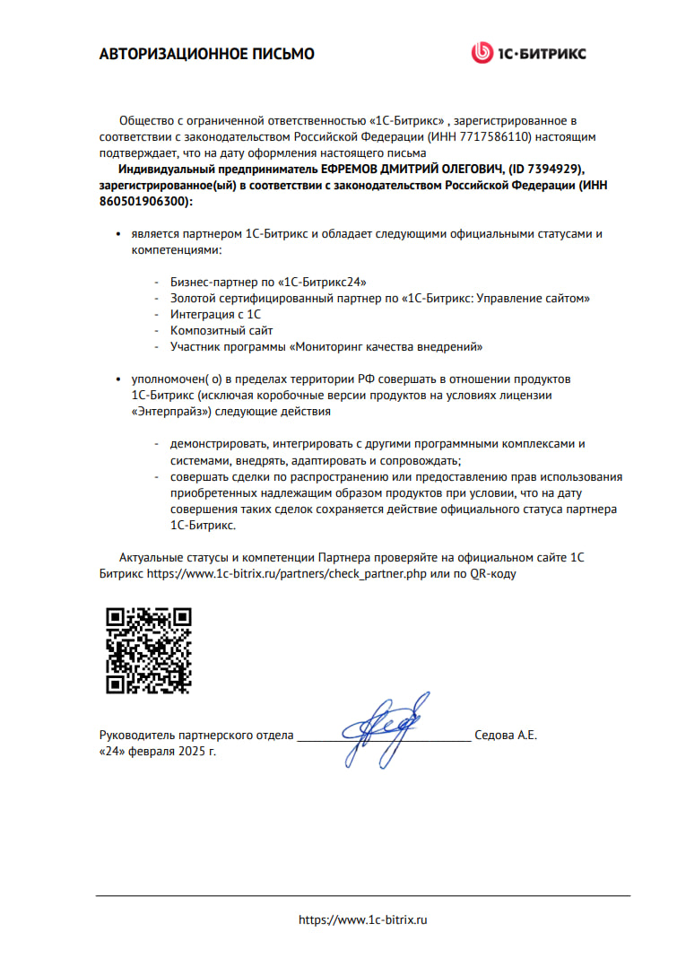Сертификат "Интеграция с 1C"