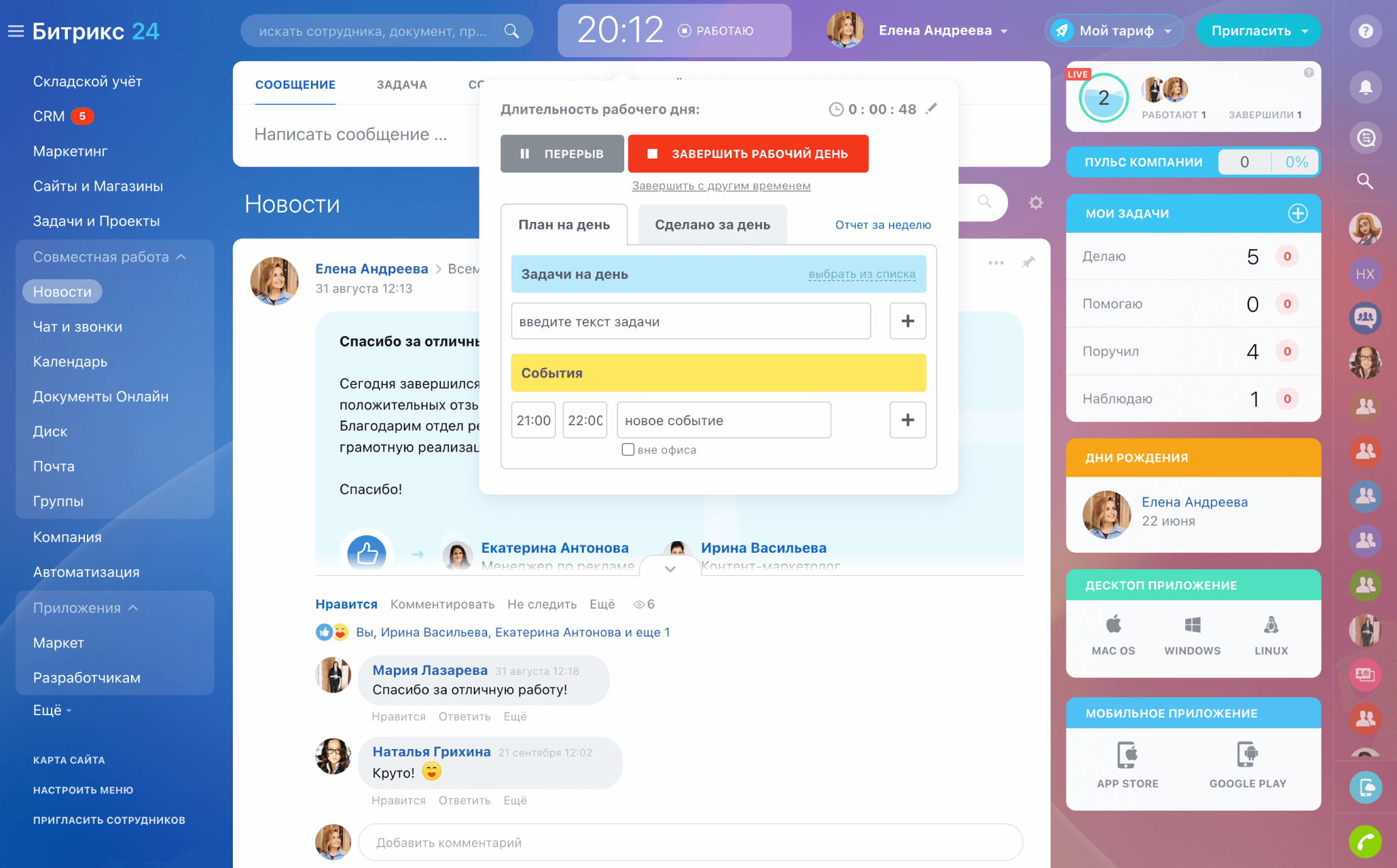 Коллеги, клиенты и подрядчики на связи — с высоким качеством видео и аудио, стабильным соединением и поддержкой групповых звонков до 48 человек. Звонок легко начать прямо из задачи, события в календаре или поста в Новостях компании.