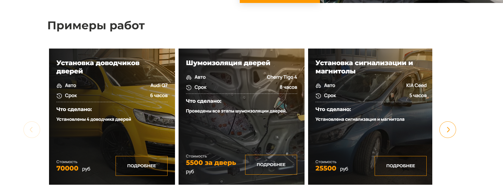 Для каждого элемента портфолио наш клиент из административной части сайта может заполнять марку авто, для которого проводились работы, город, дату выполнения, срок выполнения, общую стоимость. Помимо этого можно выбрать категорию работ, чтобы к странице подключился соответствующий раздел прайс-листа, и выбрать оказанные услуги из списка.